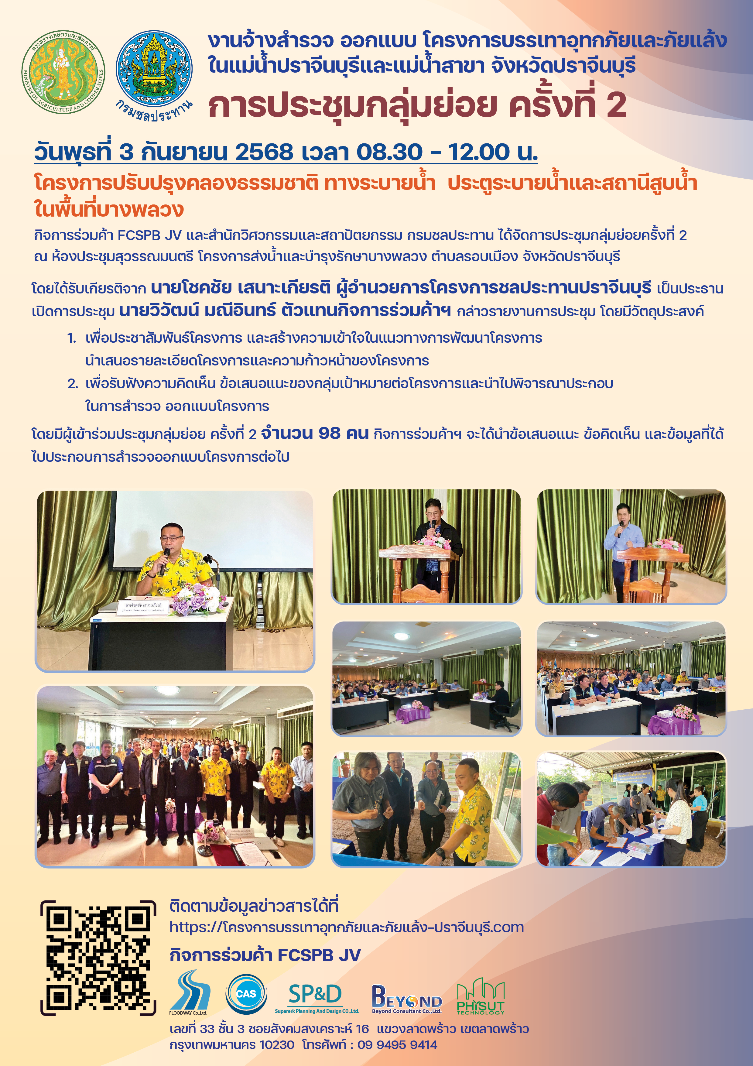 ผู้แทนกิจการร่วมค้า FCSPB JV ได้เข้าพบ นาย นายโชคชัย เสนาะเกียรติ ผู้อำนวยการโครงการชลประทานปราจีนบุรี และนายเอ บุญชัง ผู้อำนวยการโครงการส่งน้ำและบำรุงรักษาบางพลวง และรายงานวัตถุประสงค์ของการประชุมกลุ่มย่อยครั้งที่ 2 วันพุธที่ 3 กันยายน 2568 พร้อมทั้งนำเสนอรายละเอียดของการประชุมกลุ่มย่อยครั้งที่ 2