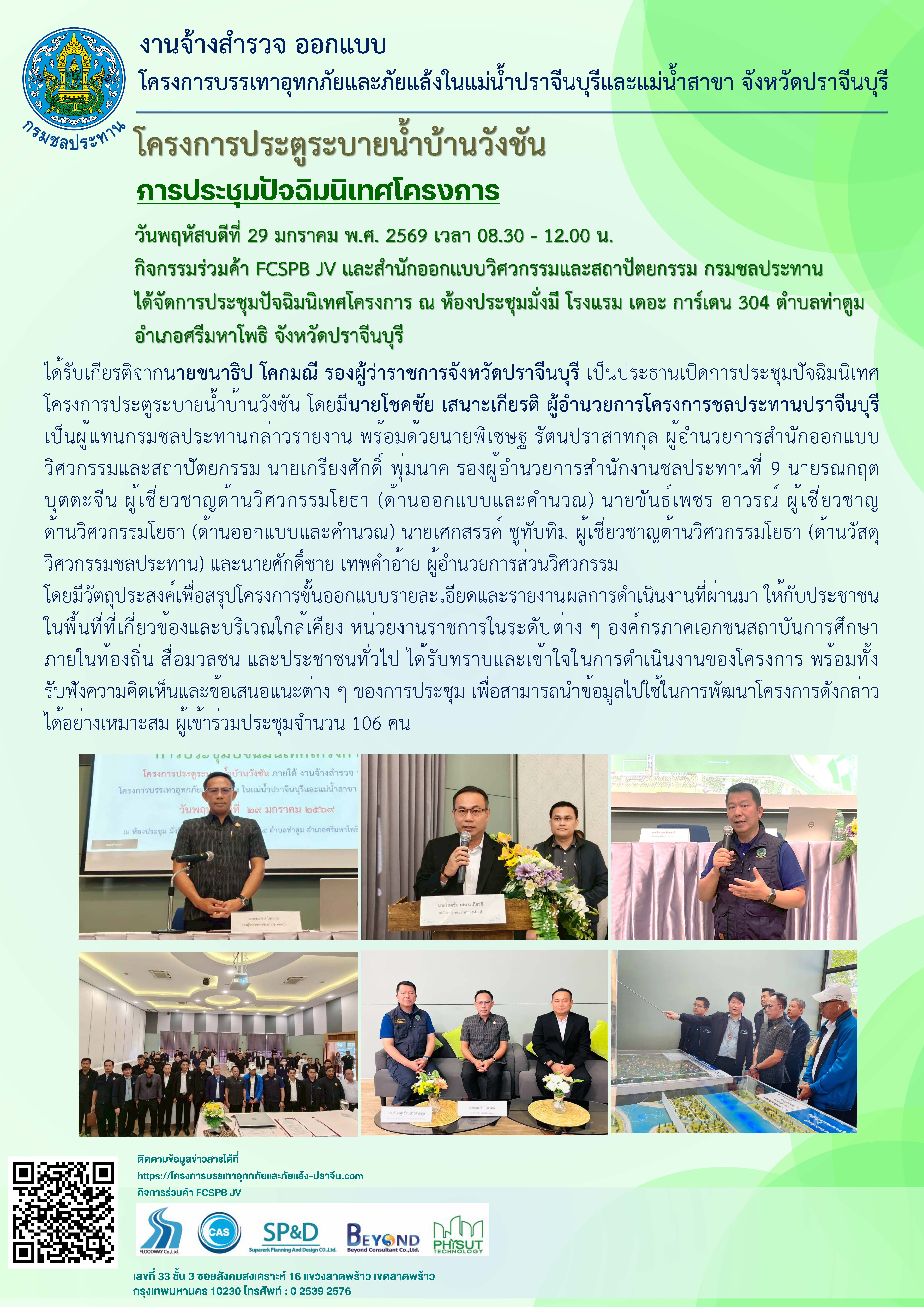 กิจการร่วมค้า FCSPB JV และสำนักออกแบบวิศวกรรมและสถาปัตยกรรม กรมชลประทาน ได้จัดการประชุมปฐมนิเทศโครงการฯ โดยนายวีระพันธ์ ดีอ่อน ผู้ว่าราชการจังหวัดปราจีนบุรี มอบหมายให้นางสาวจุฑามาศ บัวเผื่อน นายอำเภอศรีมหาโพธิ เป็นประธานเปิดการประชุมปฐมนิเทศโครงการประตูระบายน้ำบ้านวังชัน พร้อมด้วย รศ.ดร.สายสุนีย์พุทธาคุณเจริญ คณะกรรมการลุ่มน้ำบางปะกง นายพิเชษฐ รัตนปราสาทกุล ผู้อำนวยการสำนักออกแบบวิศวกรรมและสถาปัตยกรรม โดยมีนายศักดิ์ชาย เทพคำอ้าย ผู้อำนวยการส่วนมาตรฐานการออกแบบ เป็นผู้แทนกรมชลประทานกล่าวรายงาน นายเอ บุญชัง ผู้อำนวยการโครงการส่งน้ำและบำรุงรักษาบางพลวง นายโชคชัย เสนาะเกียรติ ผู้อำนวยการโครงการชลประทานปราจีนบุรี นายวิเชษฐ์ บุตตะจีน ผู้เชี่ยวชาญด้านวิศวกรรมโยธา และนายขันธ์เพชร อาวรณ์ ผู้อำนวยการส่วนวิศวกรรม โดยมีวัตถุประสงค์เพื่อประชาสัมพันธ์และนำเสนอข้อมูลเบื้องต้นเกี่ยวกับการดำเนินงานสำรวจออกแบบของโครงการ รวมถึงรายละเอียดต่าง ๆ ให้กับหน่วยงานราช ภาคเอกชน ตลอดจนประชาชนผู้ที่สนใจและผู้ที่เกี่ยวข้องได้รับทราบ พร้อมทั้งรับฟังข้อคิดเนและข้อเสนอแนะต่าง ๆ อันจะเป็นประโยชน์ ต่อการดำเนินงาน โดยมีผู้เข้าร่วมประชุม ปฐมนิเทศโครงการ จำนวน 112 คน