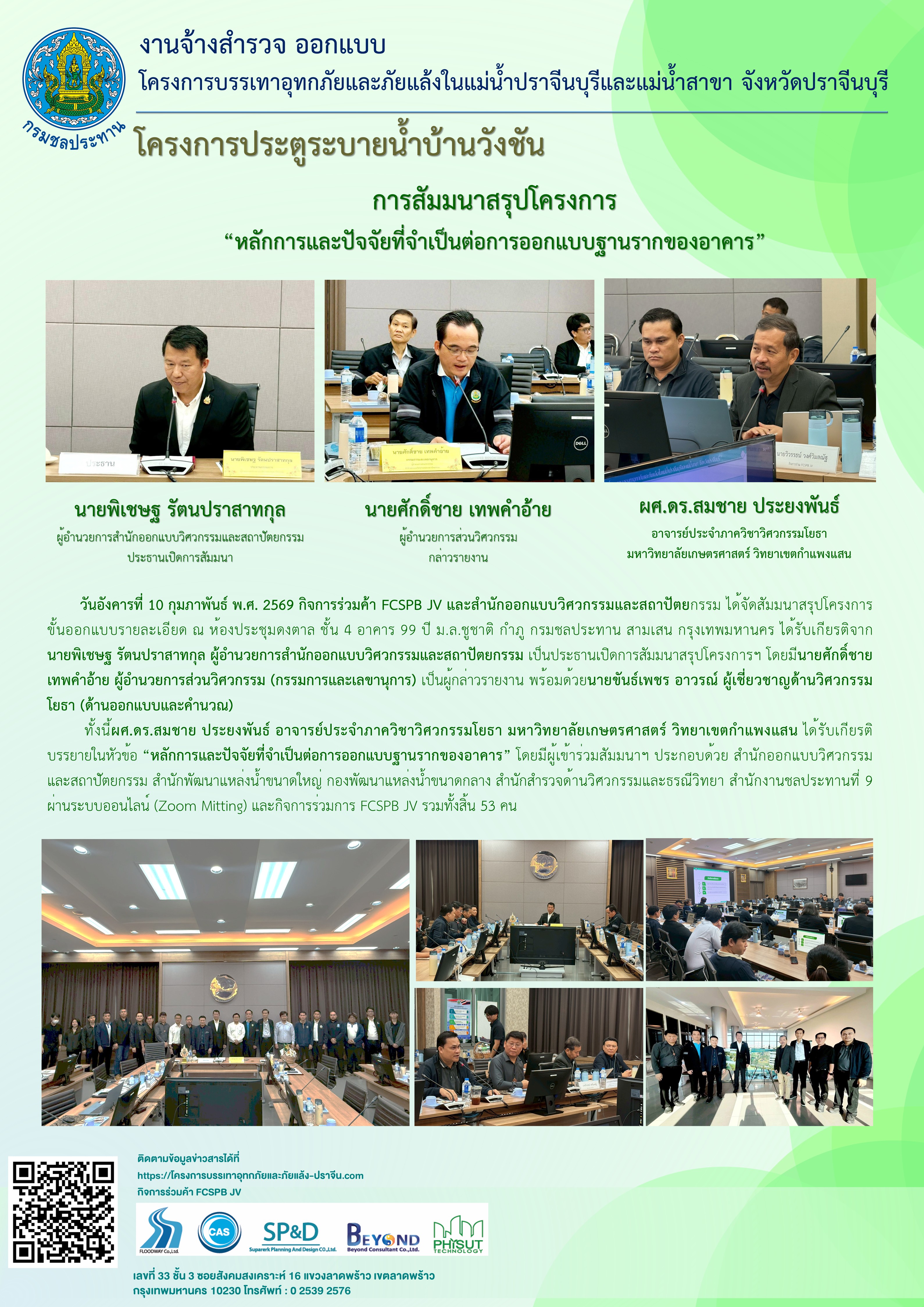 ได้จัดการประชุมปัจฉิมนิเทศโครงการ ณ ห้องประชุมเดอะ การ์เดน ฮอลล์ โรงแรม เดอะ การ์เดน 304 ตำบลท่าตูม อำเภอศรีมหาโพธิ จังหวัดปราจีนบุรี โดยได้รับเกียรติจาก นายชนาธิป โคกมณี รองผู้ว่าราชการจังหวัดปราจีนบุรี เป็นประธานเปิดการประชุม นายโชคชัย เสนาะเกียรติ ผู้อำนวยการโครงการชลประทานปราจีนบุรี กล่าวรายงานการประชุม โดยวัตถุประสงค์ เพื่อสรุปโครงการขั้นออกแบบรายละเอียดและรายงานผลการดำเนินงานที่ผ่านมา