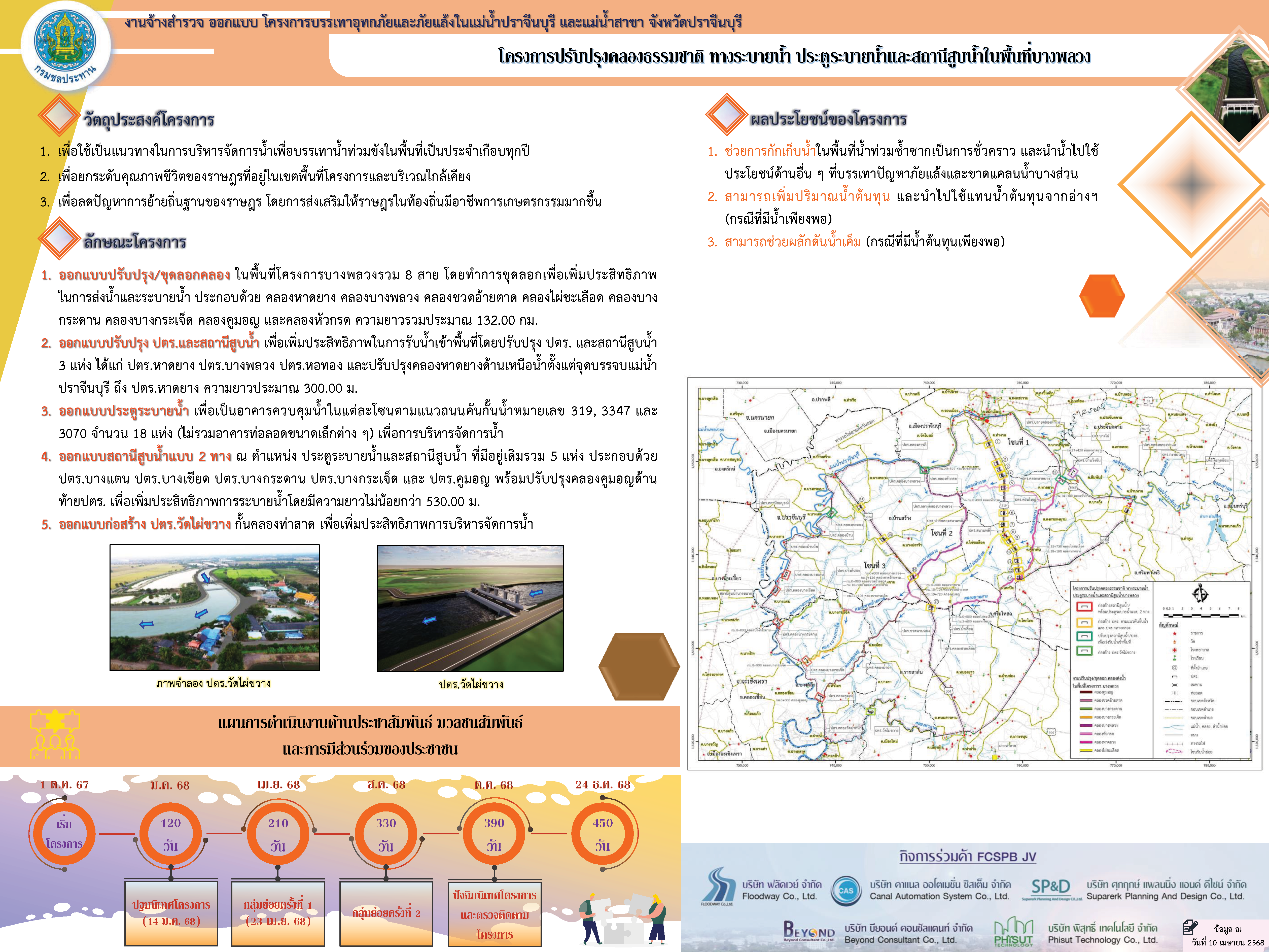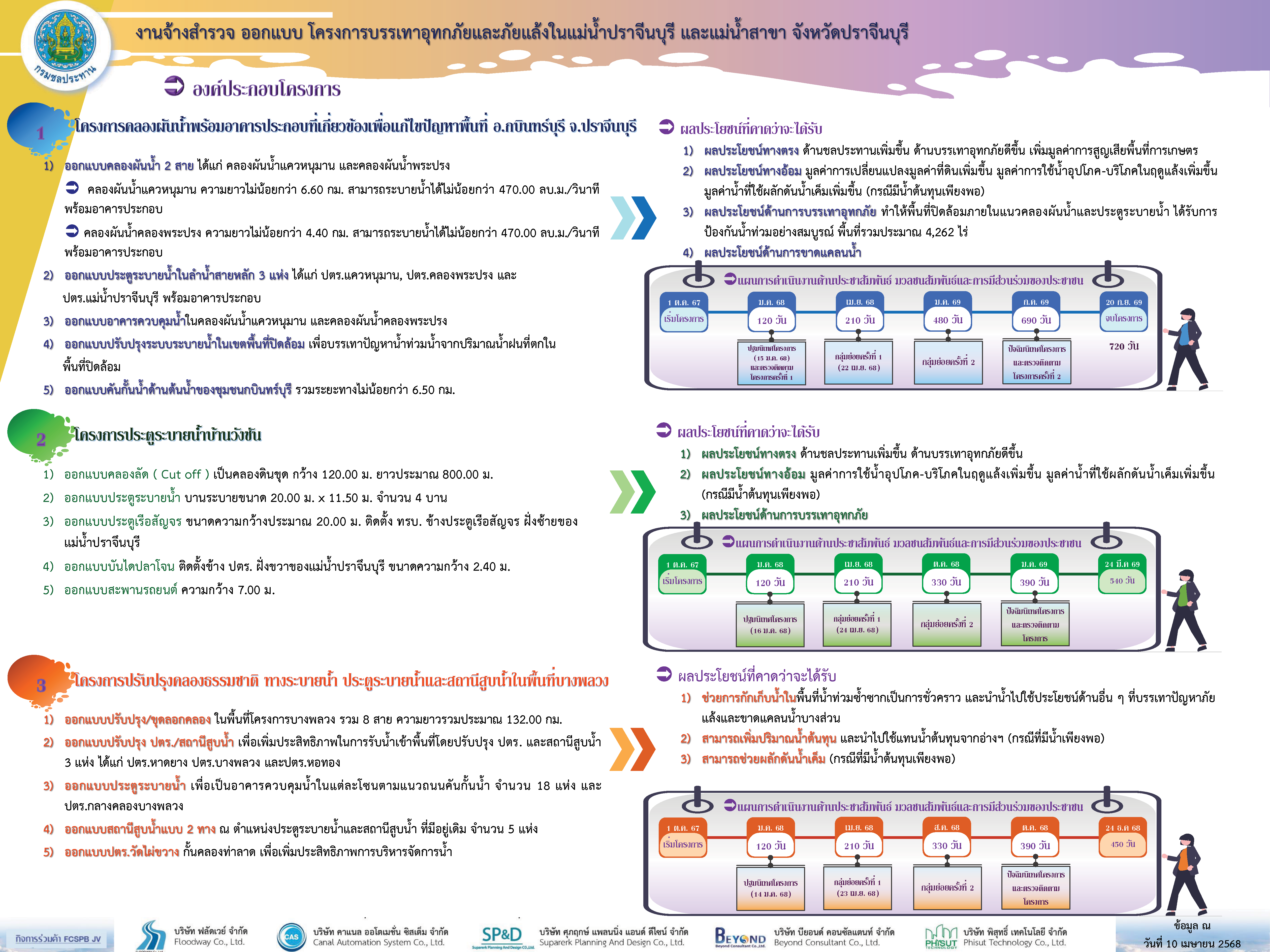 ปี 2567 กรมชลประทาน ได้ว่าจ้างให้กิจการร่วมค้า FCSPB JV ซึ่งประกอบด้วย บริษัท ฟลัดเวย์ จำกัด บริษัท คาแนล ออโตเมชั่น ซิสเต็ม จำกัด บริษัท ศุภฤกษ์ แพลนนิ่ง แอนด์ ดีไซน์ จำกัด บริษัท บียอนด์ คอนซัลแตนท์ จำกัด และบริษัท พิสุทธิ์ เทคโนโลยี จำกัด  ดำเนินการสำรวจ ออกแบบโครงการบรรเทาอุทกภัยและภัยแล้งในแม่น้ำปราจีนบุรีและแม่น้ำสาขา จังหวัดปราจีนบุรี ประกอบด้วย โครงการย่อย 3 โครงการ ในพื้นที่ลุ่มน้ำบางปะกง คือ