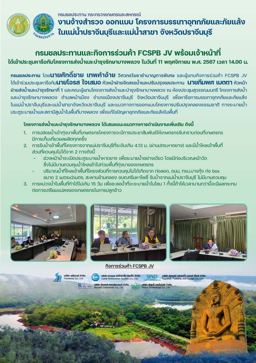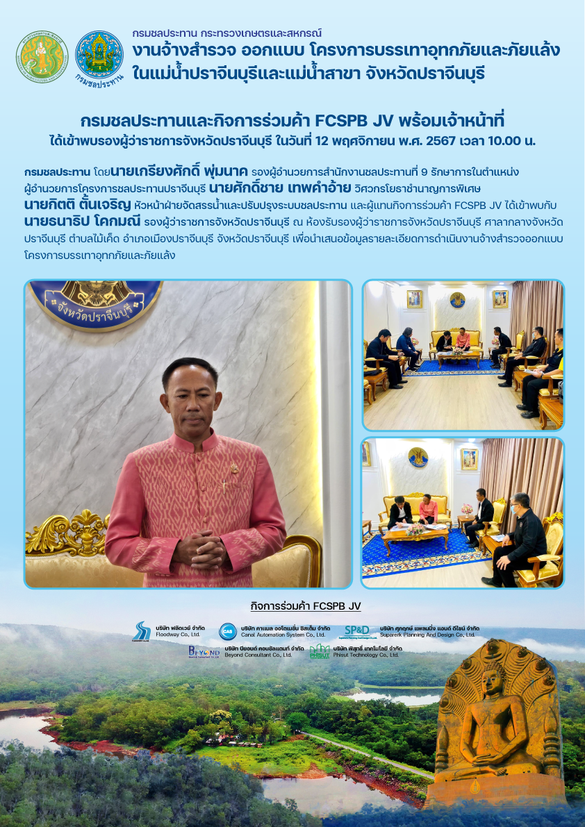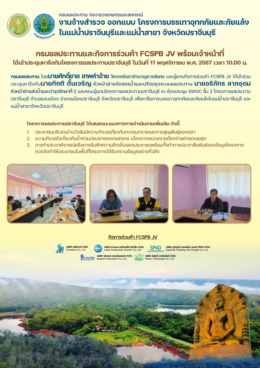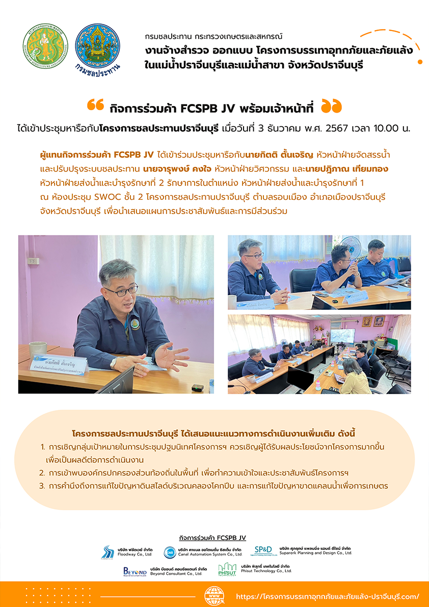 กิจการร่วมค้า FCSPB JV เข้าหารือการดำเนินงานประชาสัมพันธ์​ของงานจ้างสำรวจออกแบบ โครงการบรรเทาอุทกภัยและภัยแล้งในแม่น้ำปราจีนบุรีและแม่น้ำสาขา จังหวัดปราจีนบุรี โดยนายโชคชัย เสนาะเกียรติ ผู้อำนวยการโครงการชลประทานปราจีนบุรี สำนักงานชลประทานที่ 9 มอบหมายให้ นายจารุพงษ์ คงใจ หัวหน้าฝ่ายวิศวกรรม นายกิตติ ตั้นเจริญ หัวหน้าฝ่ายจัดสรรน้ำและปรับปรุงระบบชลประทาน และนายปฎิภาณ เทียมทอง หัวหน้าฝ่ายส่งน้ำและบำรุงรักษาที่ 2 รักษาการในตำแหน่ง หัวหน้าฝ่ายส่งน้ำและบำรุงรักษาที่ 1
